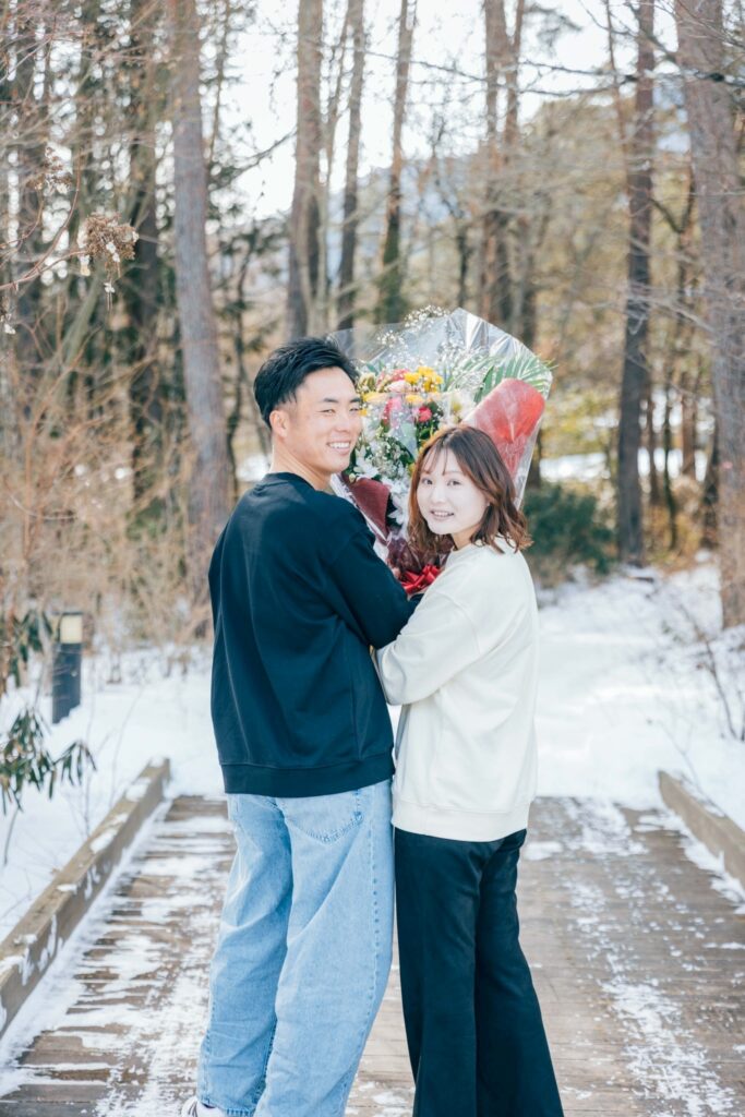 花束と2人のアイテムをお持ちになって寒い冬ですが、空気が透き通った季節ならではのロケーション撮影ができました!